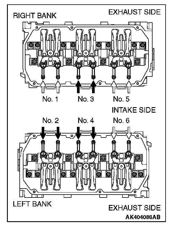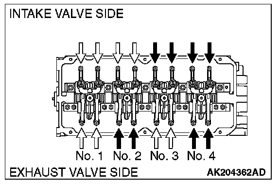 5. Valve clearance inspection and adjustment can be performed on rocker arms indicated by white arrow mark when the No. 1 cylinder piston is at the top dead center on the compression stroke, and on rocker arms indicated by black arrow mark when the No.4 cylinder piston is at the top dead center on the compression stroke.