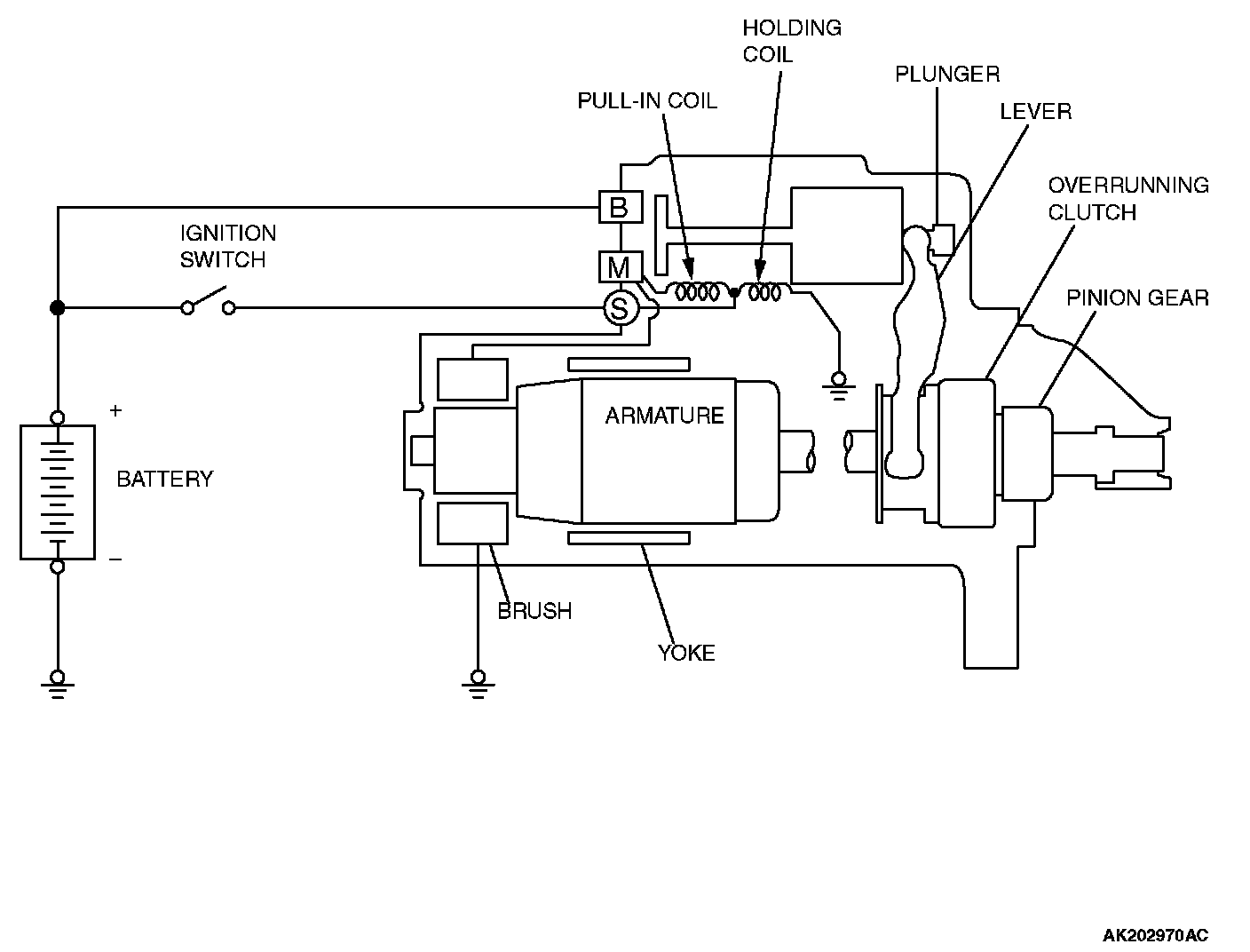 GENERAL DESCRIPTIONIf the ignition switch is turned to the "START" position, current flows in the coil provided inside magnetic switch, attracting the plunger. When the plunger is attracted, the lever connected to the plunger is