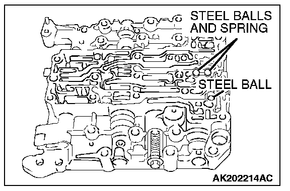 Install the steel balls (three pieces) and springs (two pieces) to the inside valve body as shown.