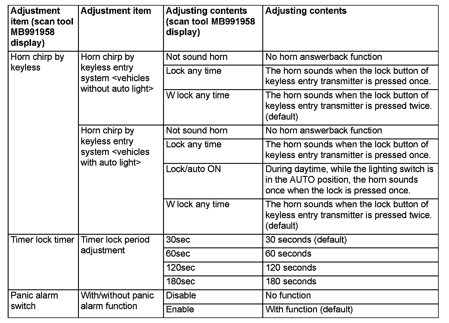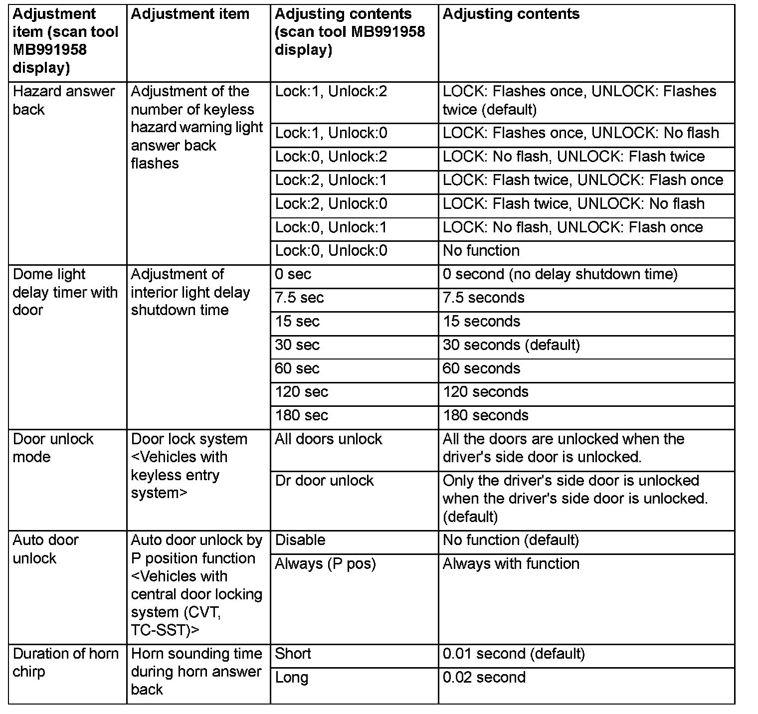 By operating the ETACS system or MMCS of scan tool MB991958, the following functions can be programmed. The programmed information is held even when the battery is disconnected.