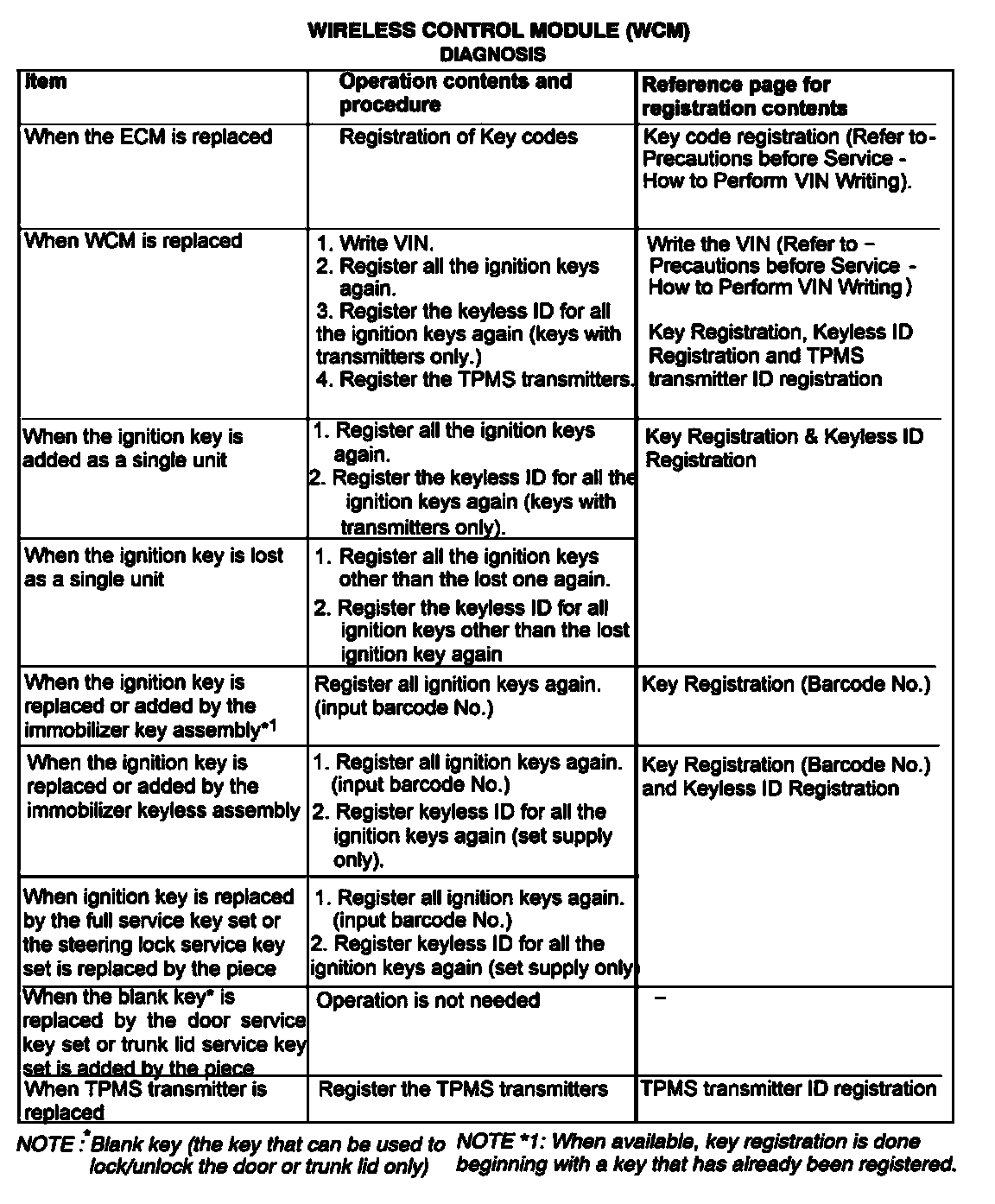 The transponder (a small transmitter) in the ignition key, WCM, and the ECM have their own ID codes stored in them. When the cases listed in the table below occur, the ID codes must be registered in the WCM or ECM again.