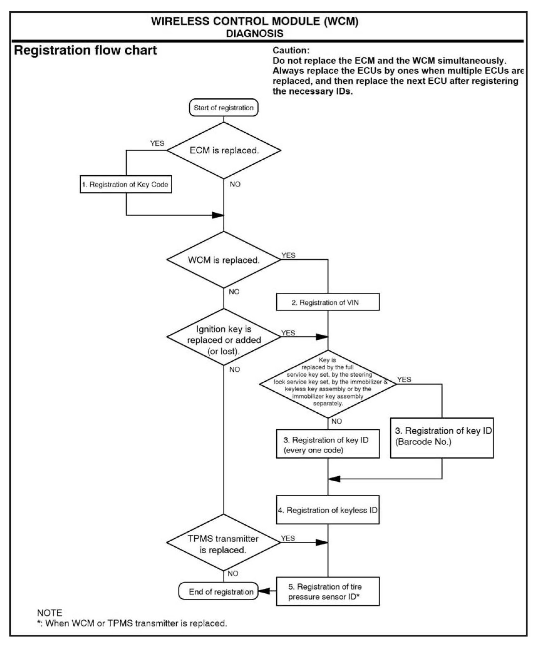 CAUTION: Do not replace the engine control module (ECM) and WCM at the same time. When replacing several ECUs, always replace one ECU at a time, register the necessary IDs in it, and then replace the next ECU.