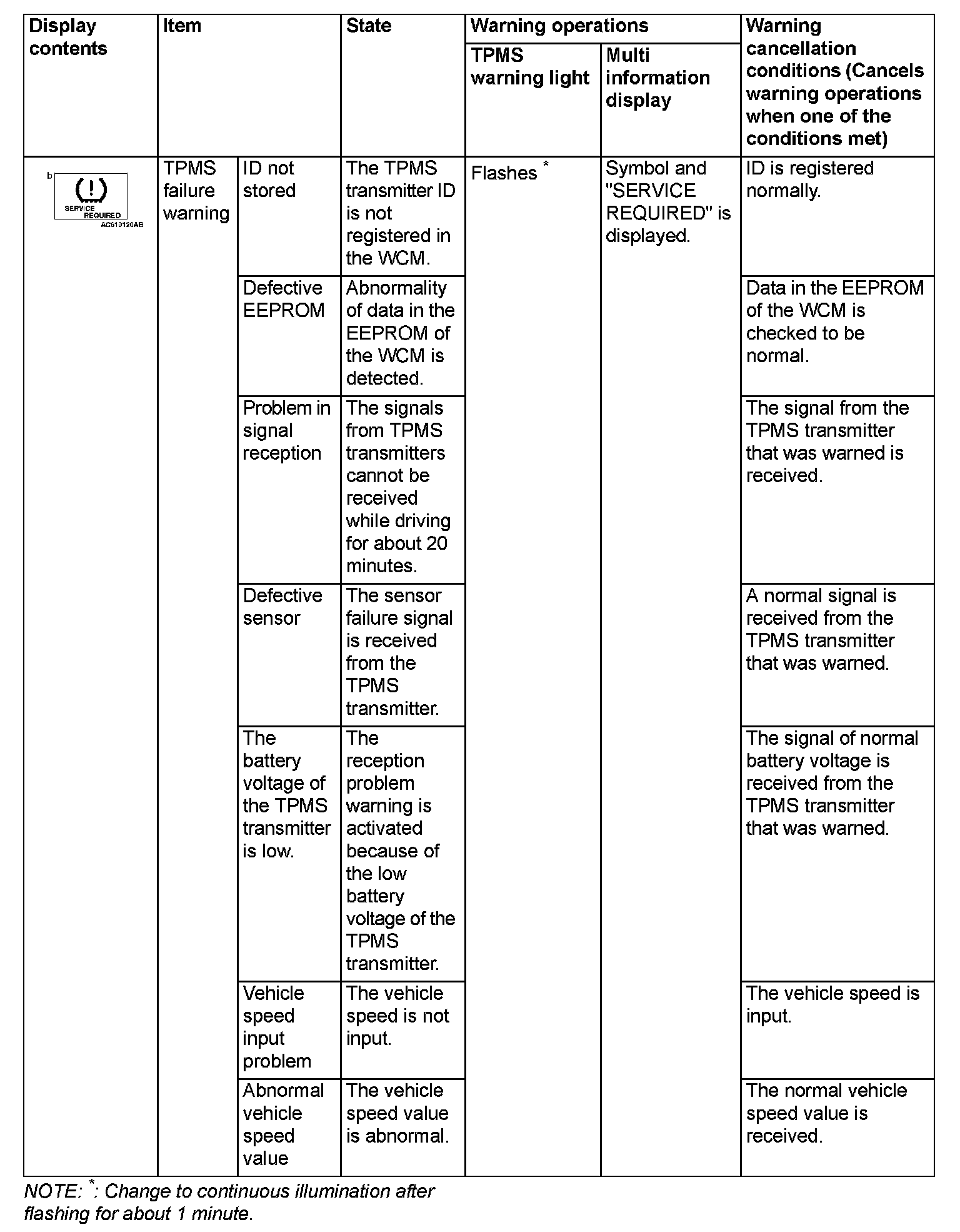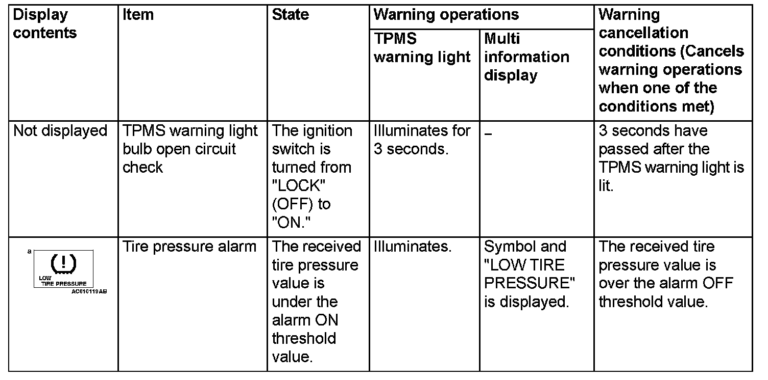 If the TPMS fails or the tire pressure is low, the WCM warns the driver of that state by the TPMS warning light and the multi information display in the combination meter.