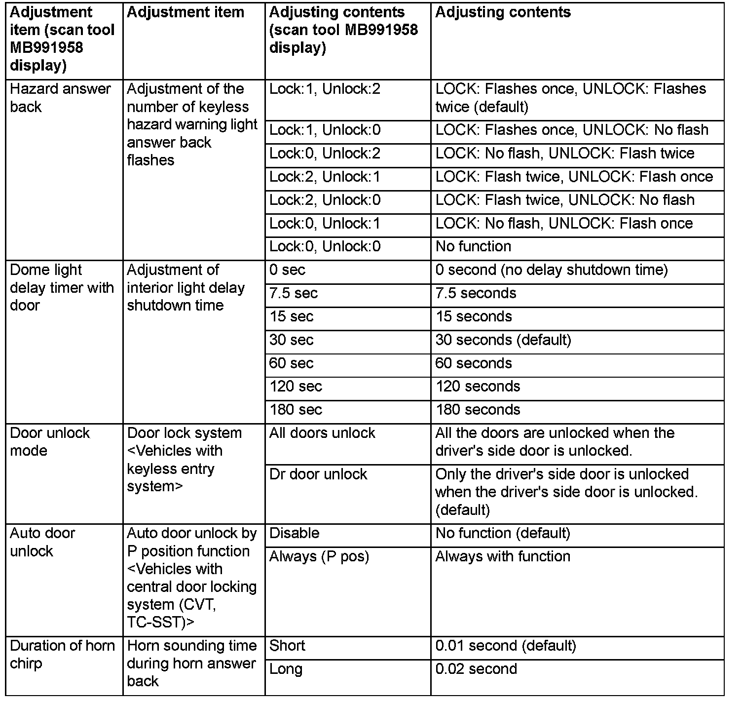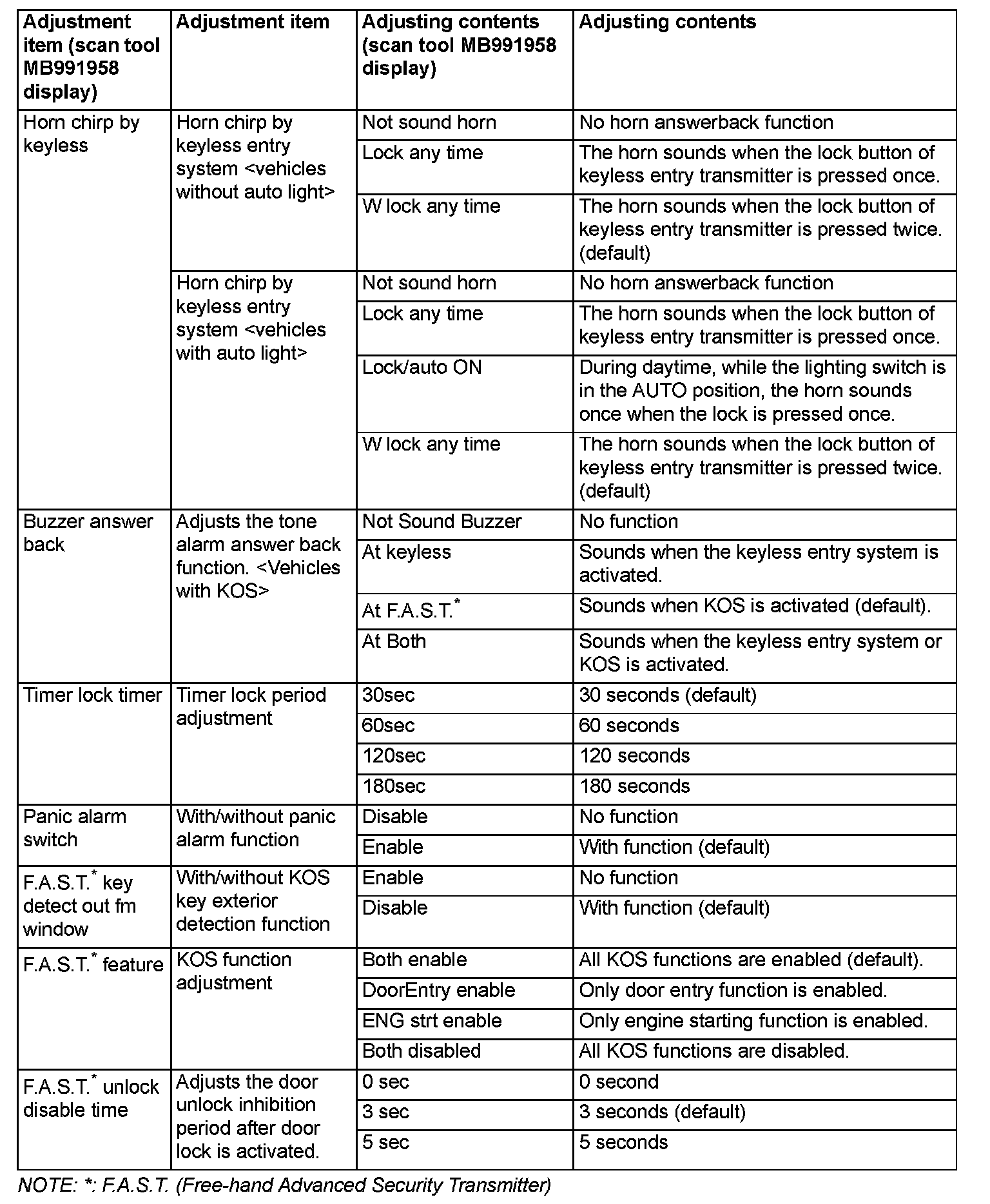 By operating the ETACS system or MMCS of scan tool MB991958, the following functions can be programmed. The programmed information is held even when the battery is disconnected.