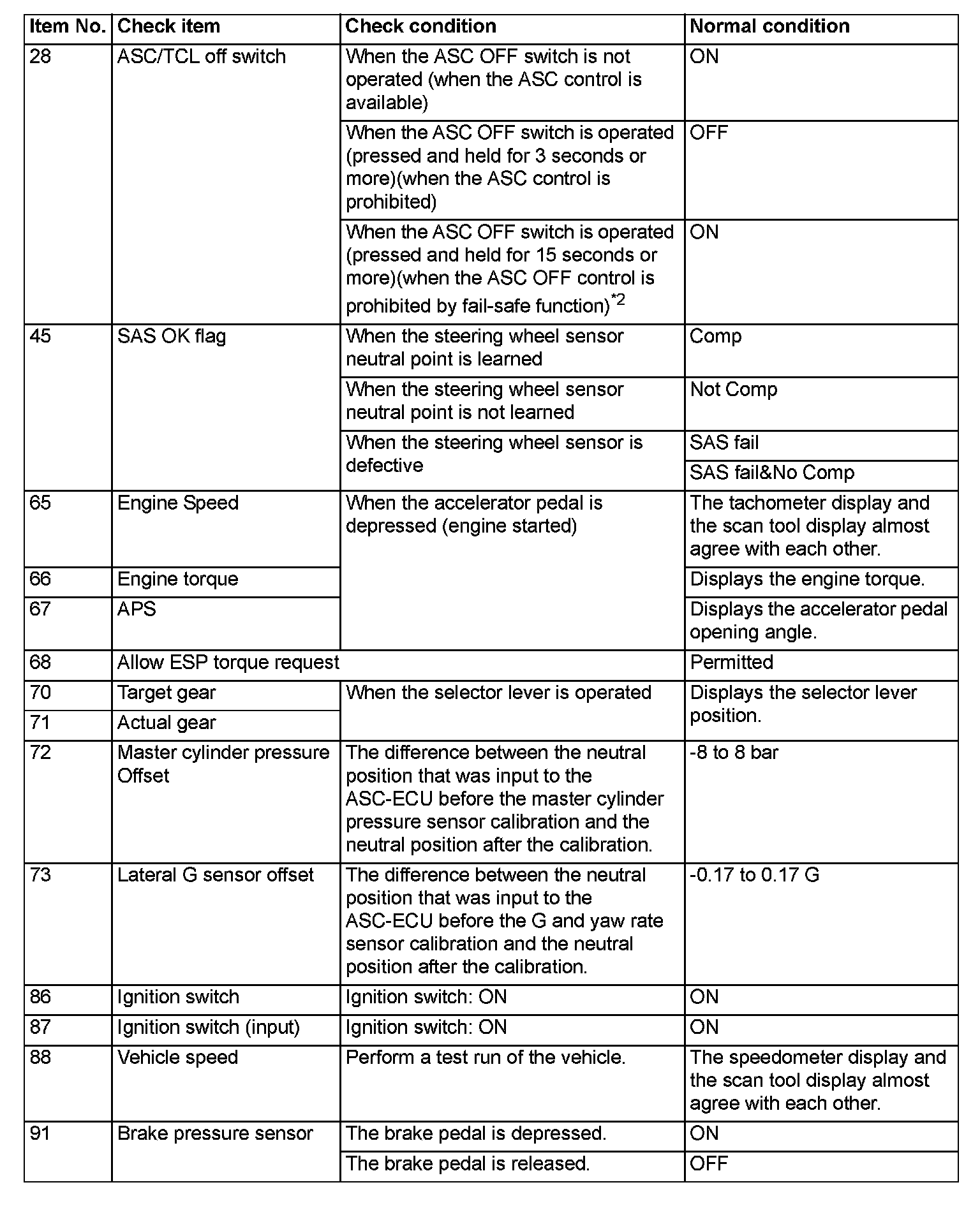 DATA LIST REFERENCE TABLEThe following items can be read by the scan tool from the ASC-ECU input data.
