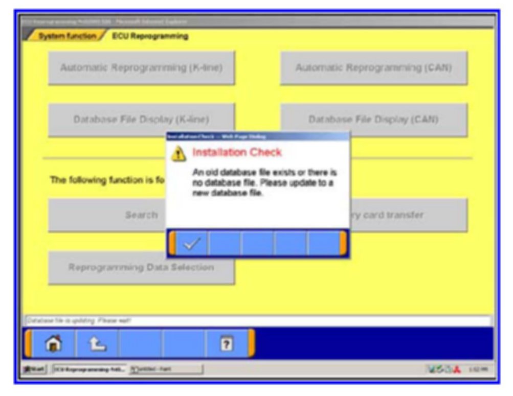 h. A screen will appear advising "Installation Check An old database file exists or there is no database file. Please update to a new database file."