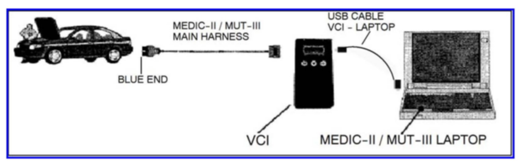 ^ Connect the MUT-III main harness with the blue DLC connection to the VCI.