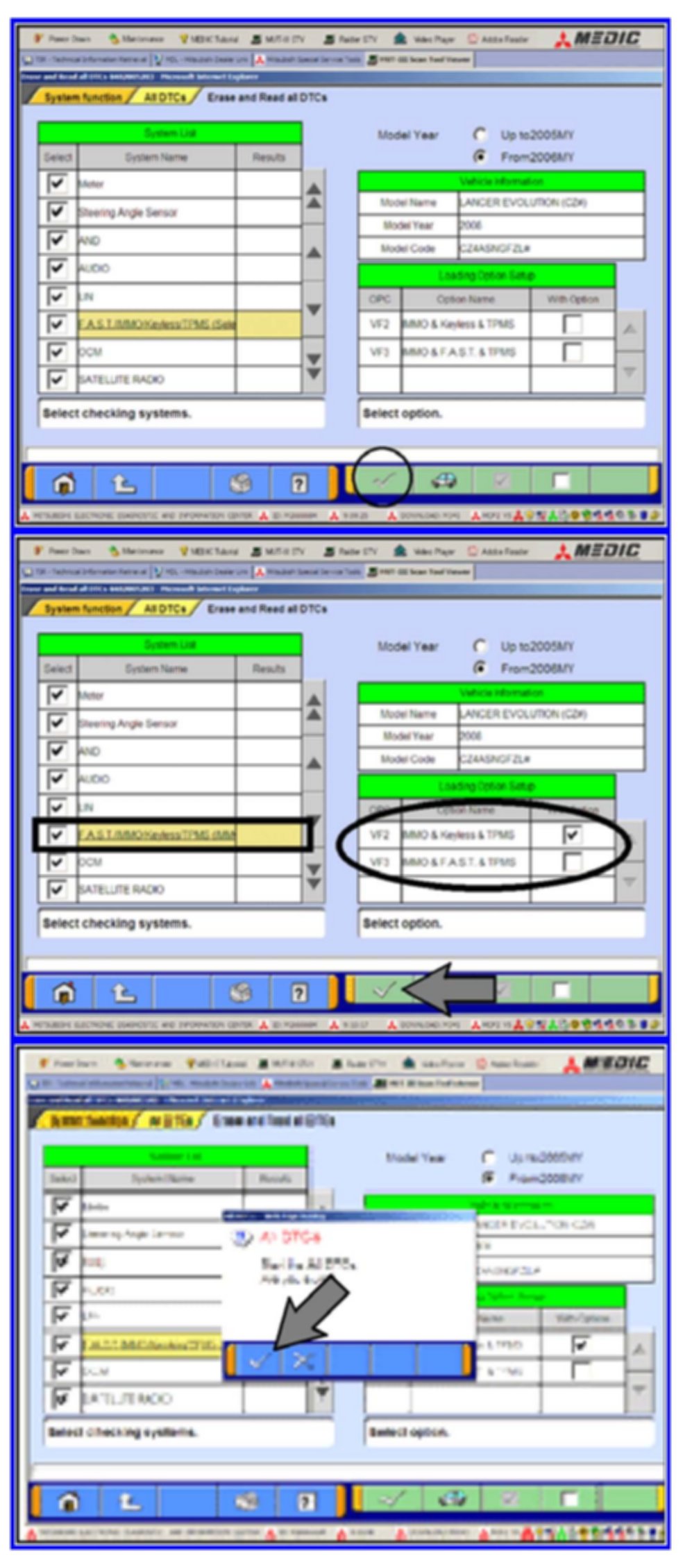3. Using the MUT-III, check and erase ALL DTCs from all systems as follows.