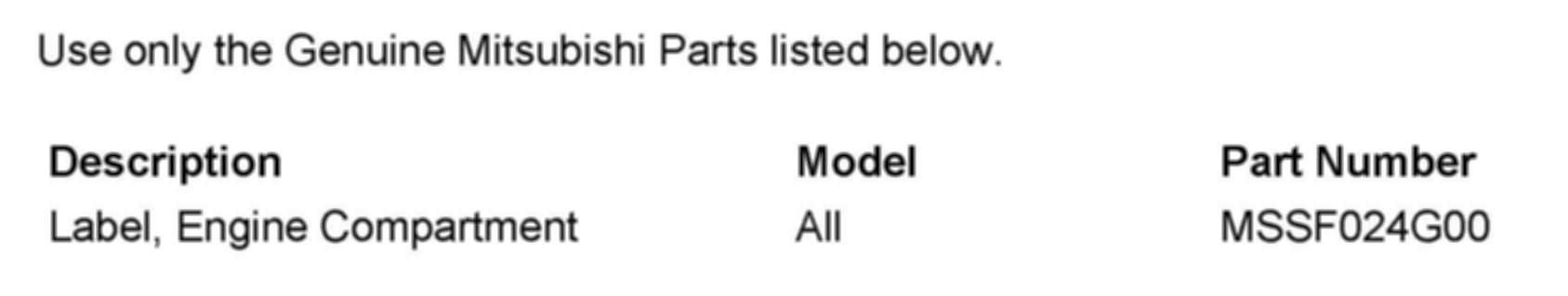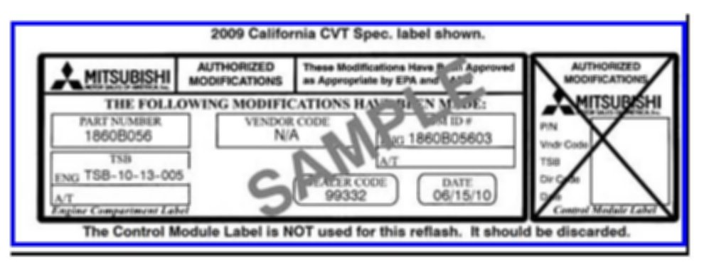 7. Using a ball-point pen, enter the appropriate Engine Control Module (ECM) part number, Software Part Number (ROM ID#), this Technical Service Bulletin number (TSB-10-13-005), your dealer code, and the current date on the Engine Compartment / Control Module Label (p/n MSSF024G00). The Vendor ode is not applicable. The label is available from your facing PDC.