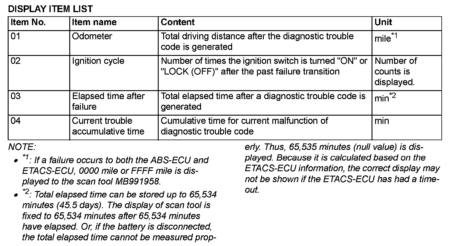 When detecting fault and storing the DTC, the ECU connected to CAN bus line obtains the data before the determination of the DTC and the data when the DTC is determined, and then stores the ECU status of that time. By analyzing the data from scan tool, the troubleshooting can be performed more efficiently. The displayed items are as shown in the table below.