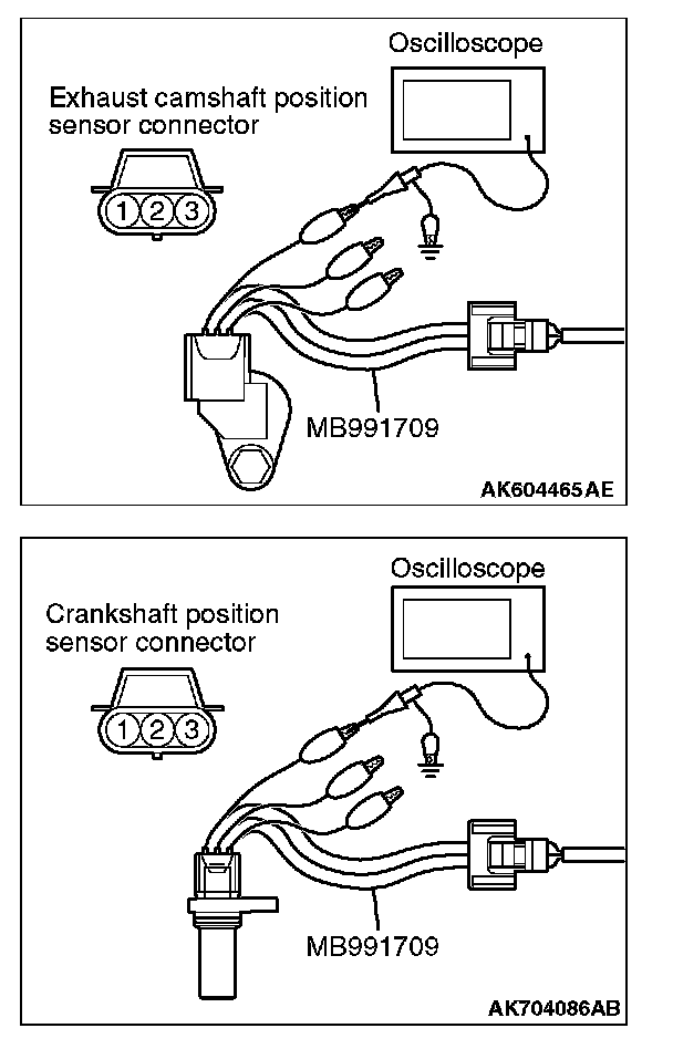 1. Disconnect the camshaft position sensor connector, and connect the test harness special tool (MB991709) between the separated connector (All terminals should be connected).