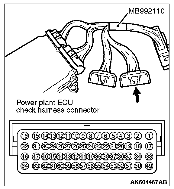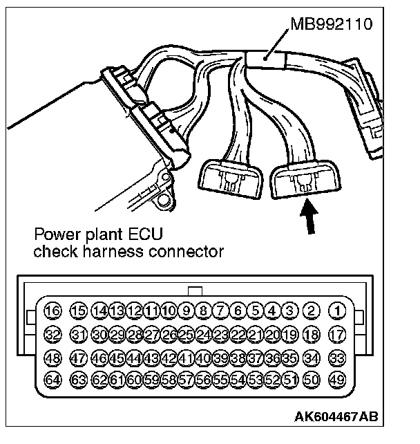 1. Disconnect all ECM connectors. Connect the check harness special tool (MB992110) between the separated connectors.