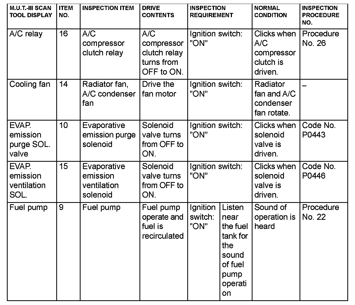 Actuator Test Reference Table