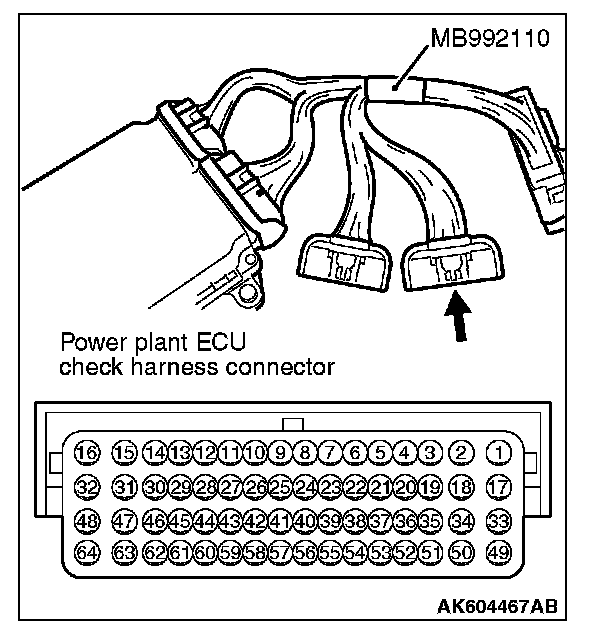 1. Disconnect all ECM connectors. Connect the check harness special tool (MB992110 between the separated connectors.