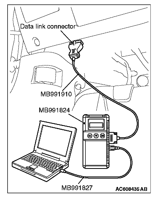 CAUTION: To prevent damage to scan tool MB991958, always turn the ignition switch to the "LOCK" (OFF) position before connecting or disconnecting scan tool MB991958.