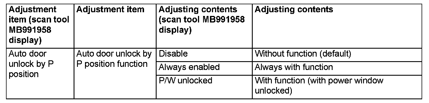 With the scan tool MB991958 operation, the following functions can be programmed. The programmed information is held even when the battery is disconnected.