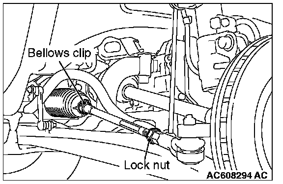 1. Adjust the toe-in by undoing the bellows clip and lock nut, and turning the left and right tie rod turnbuckles by the same amount (in opposite directions).