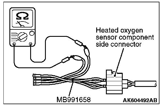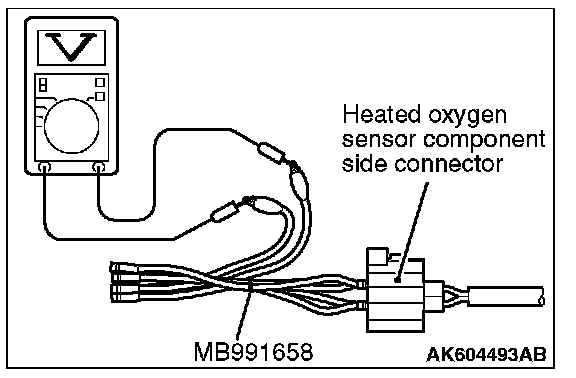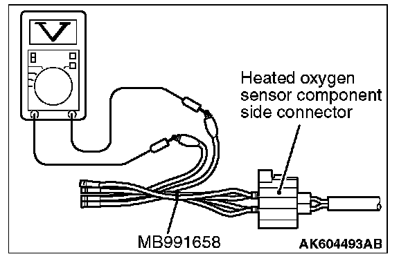 1. Disconnect the heated oxygen sensor connector and connect special tool MB991658 to the connector on the heated oxygen sensor side.