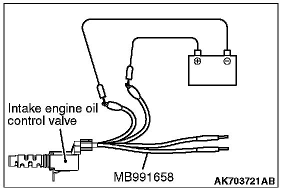 2. Check that the operation sound of the intake engine oil control valve can be heard when the positive battery voltage is supplied to the intake engine oil control valve. (Use the special tool MB991658 to connect terminal No. 2 of the intake engine oil control valve connector to the positive battery terminal and terminal No. 1 to the negative battery terminal.)