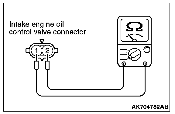 2. Measure resistance between terminal No. 1 and terminal No. 2 of the connector at the intake engine oil control valve side.