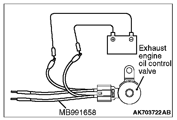 2. Check that the operation sound of the exhaust engine oil control valve can be heard when the positive battery voltage is supplied to the exhaust engine oil control valve. (Use the special tool MB991658 to connect terminal No. 2 of the exhaust engine oil control valve connector to the positive battery terminal and terminal No. 1 to the negative battery terminal.)