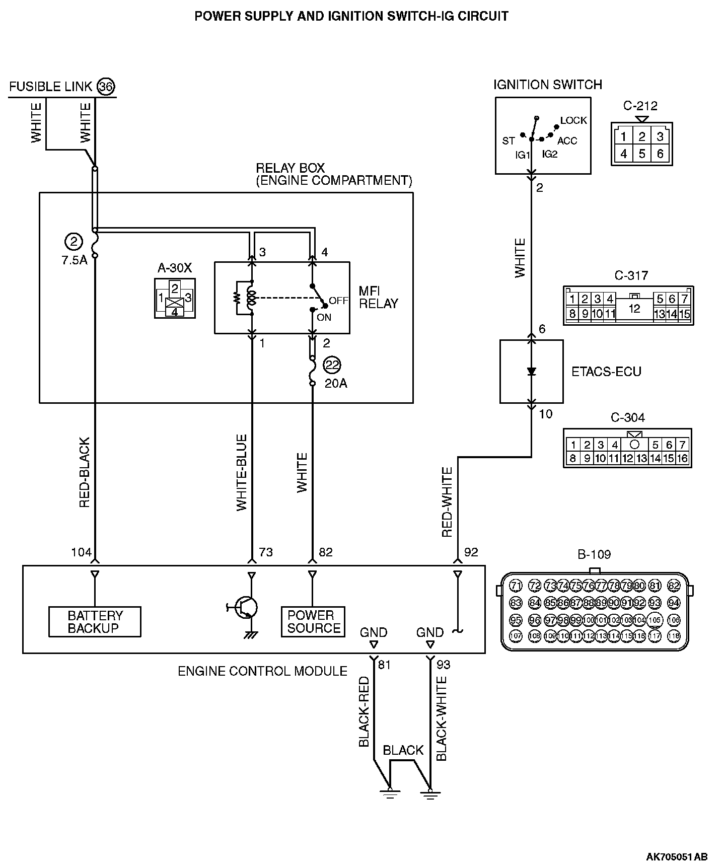 STEP 8. Check for open circuit and harness damage between MFI relay connector A-30X (terminal No. 2) and ECM connector B-109 (terminal No. 82).