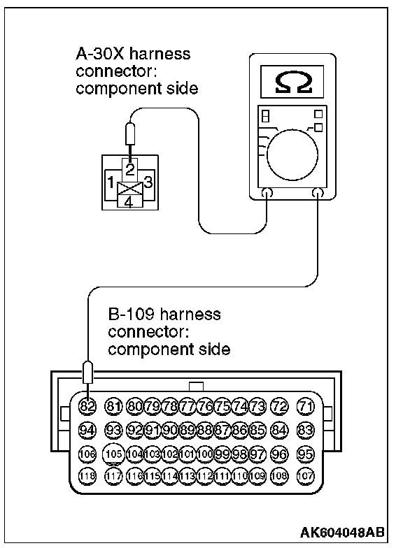 2. Measure the resistance between connector A-30X (terminal No. 2) and connector B-109 (terminal No. 82).