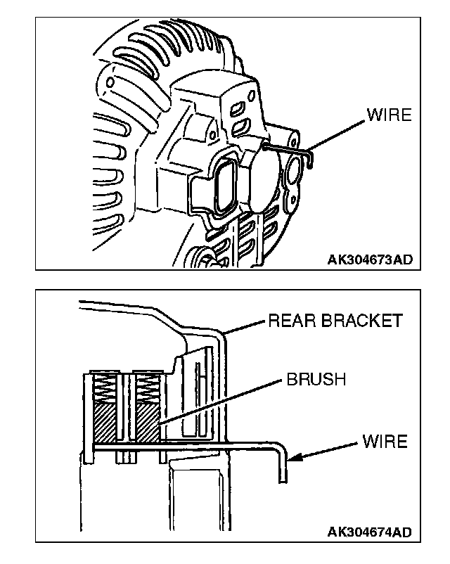After installing the regulator assembly, insert a piece of wire through the hole in the rear bracket while pressing the brush to keep the brush against movement.