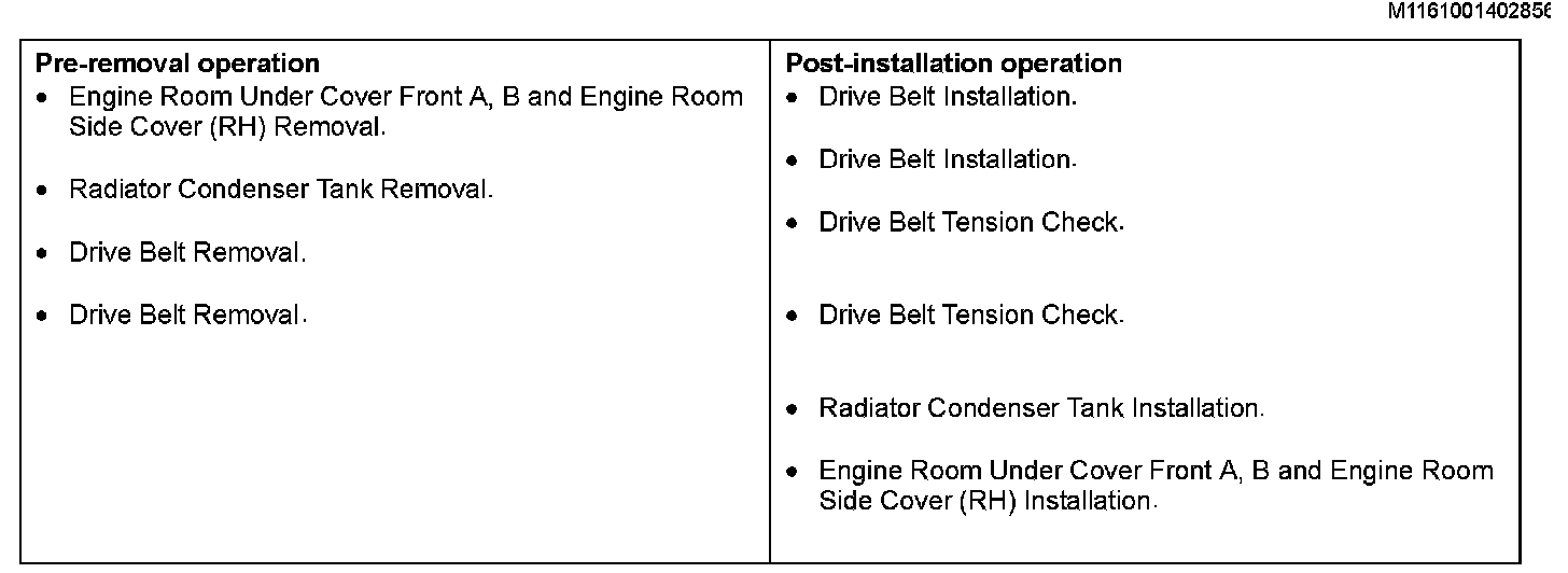 2. Tie the removed A/C compressor and clutch assembly with a string at a position where it will not interfere with the removal and installation of the generator assembly.