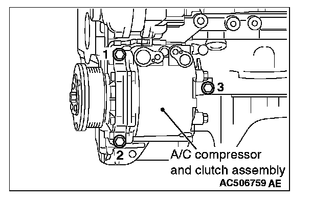 Tighten A/C compressor and clutch assembly mounting bolts to the specified torque in the order of number shown in the illustration.
