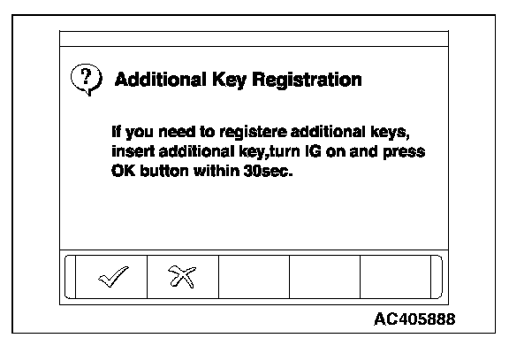 11. When the ignition key registration is finished, the additional key registration menu is displayed. To register the additional key, insert the key and turn the ignition switch to the "ON" position. Then, press the OK button. Press the CANCEL button to terminate the ignition key registration.