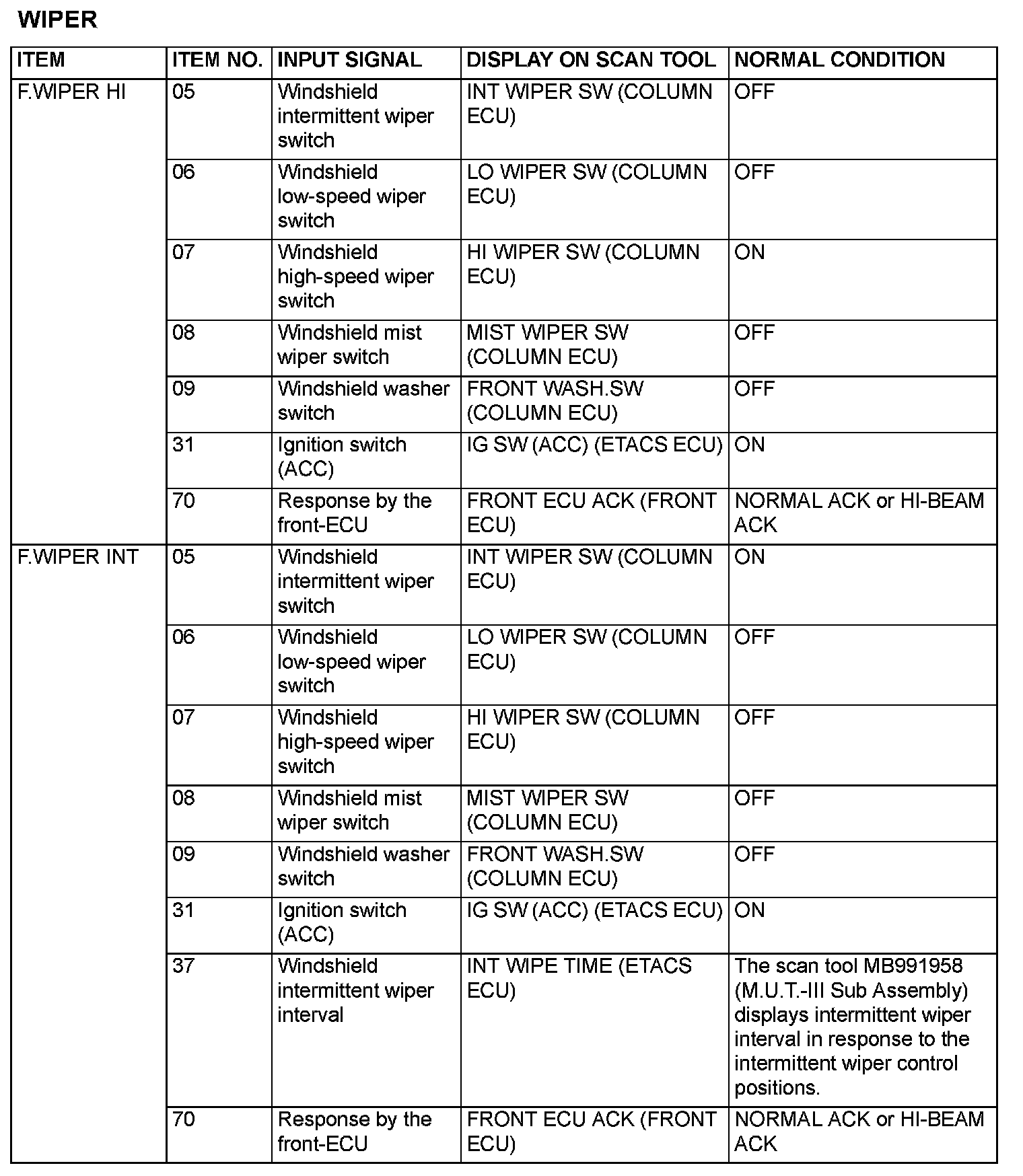 For checking item "HEADLIGHT HI", the scan tool MB991958 (M.U.T.-III Sub Assembly) displays "OFF" on the item No.2 "DIMMER SW" when the headlights are at high-beam. Therefore, the scan tool MB991958 (M.U.T.-III Sub Assembly) should display "ON" momentarily when the dimmer switch is operated.