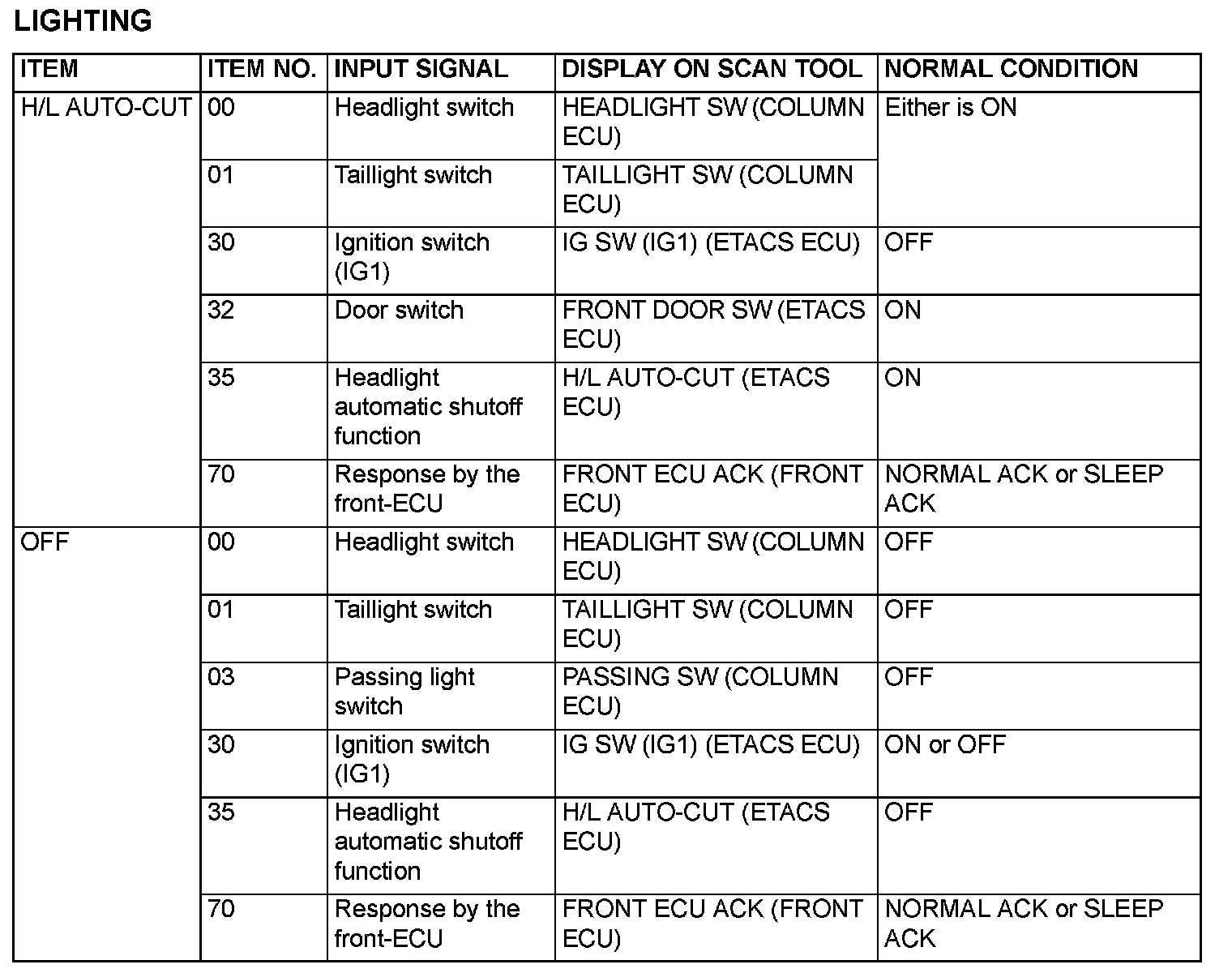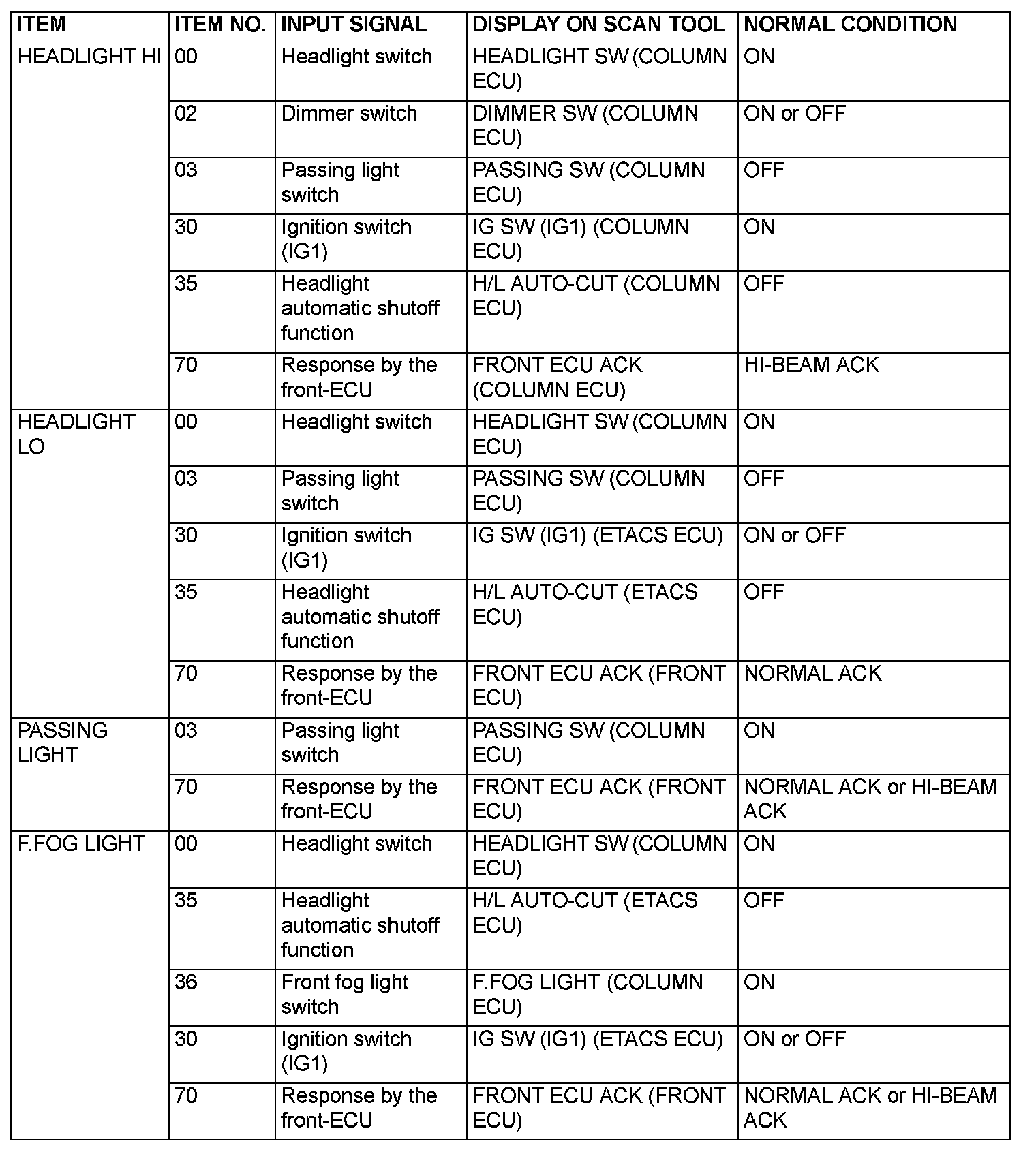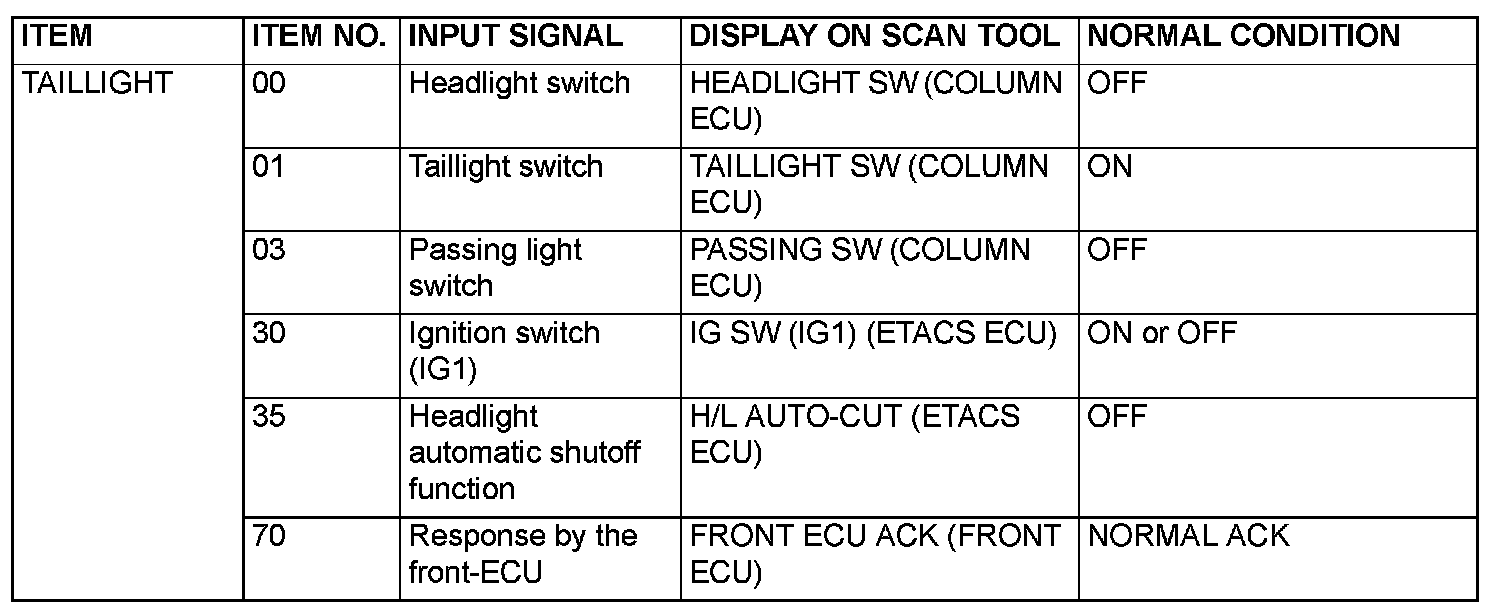 NOTE: When checking the input signals (off, tail, low-beam or high-beam), turn the ignition switch to the "ON" position in order to disable the headlight automatic shutoff function. However, since the headlight operation does not depend on the ignition switch positions, the scan tool MB991958 (M.U.T.-III Sub Assembly) does not display the title "IGNITION SWITCH".