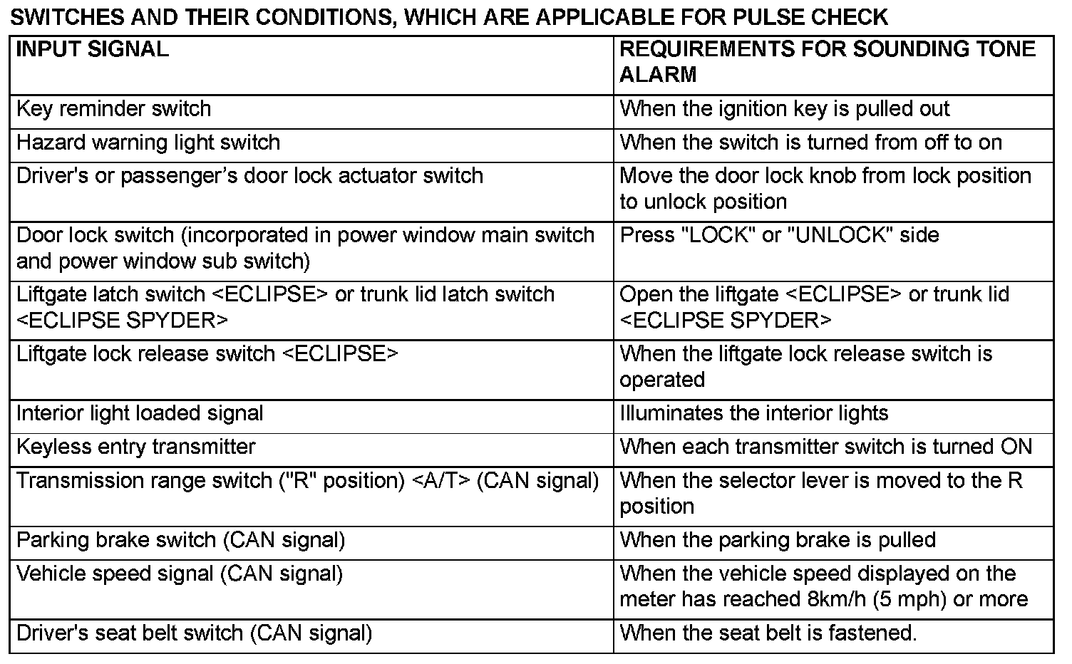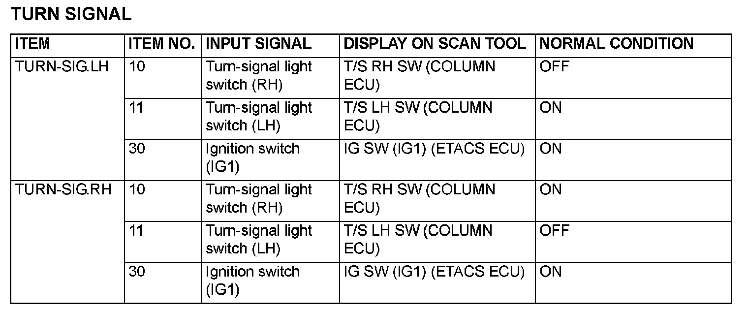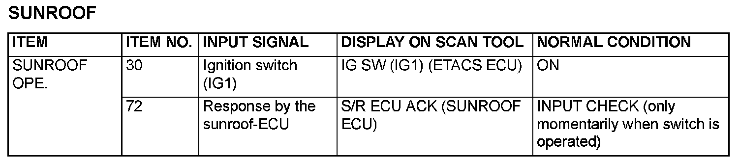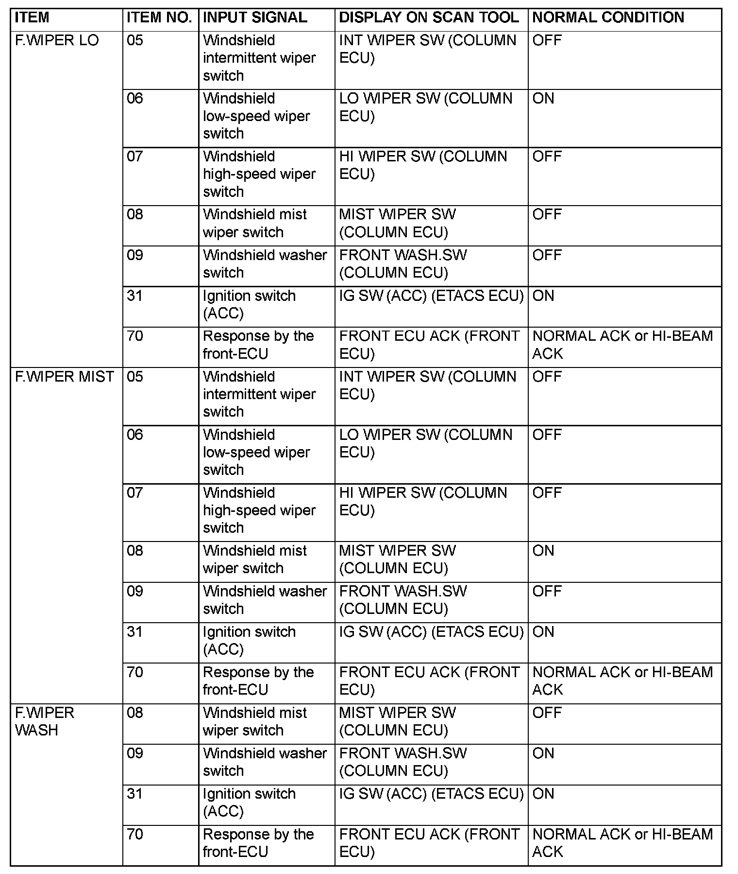 NOTE: When checking the input signals (off, tail, low-beam or high-beam), turn the ignition switch to the "ON" position in order to disable the headlight automatic shutoff function. However, since the headlight operation does not depend on the ignition switch positions, the scan tool MB991958 (M.U.T.-III Sub Assembly) does not display the title "IGNITION SWITCH".