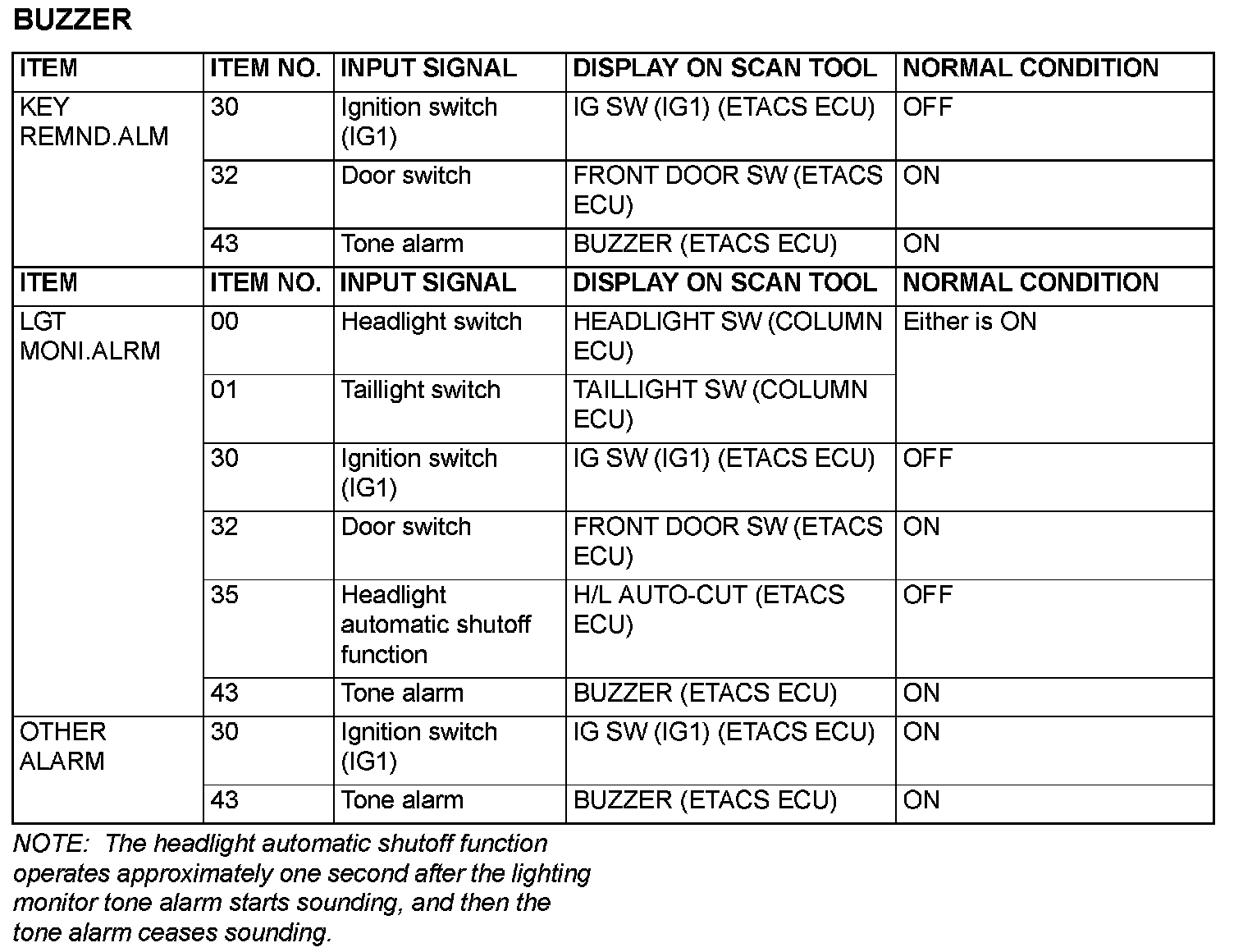 NOTE: The headlight automatic shutoff function operates approximately one second after the lighting monitor tone alarm starts sounding, and then the tone alarm ceases sounding.
