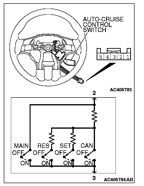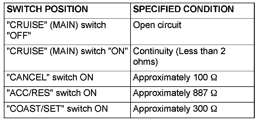 2. Measure the resistance between terminal 2 and terminal 3 when each of the "COAST/SET", "ACC/RES", "CANCEL" and "CRUISE" (MAIN) switches is pressed. If values measured at the time each switch is pressed correspond to those in the table below, the resistance values are correct.