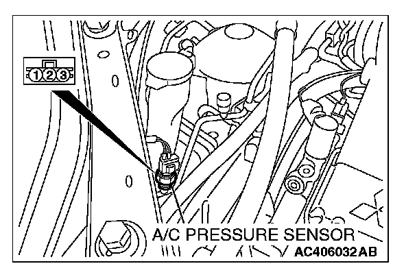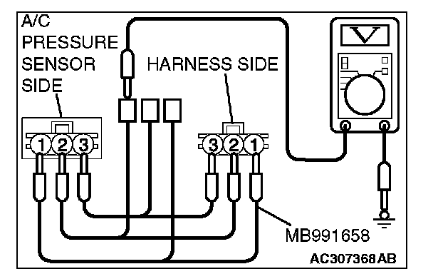 2. Disconnect the A/C pressure sensor connector and connect special tool test harness MB991658 as shown in the illustration.