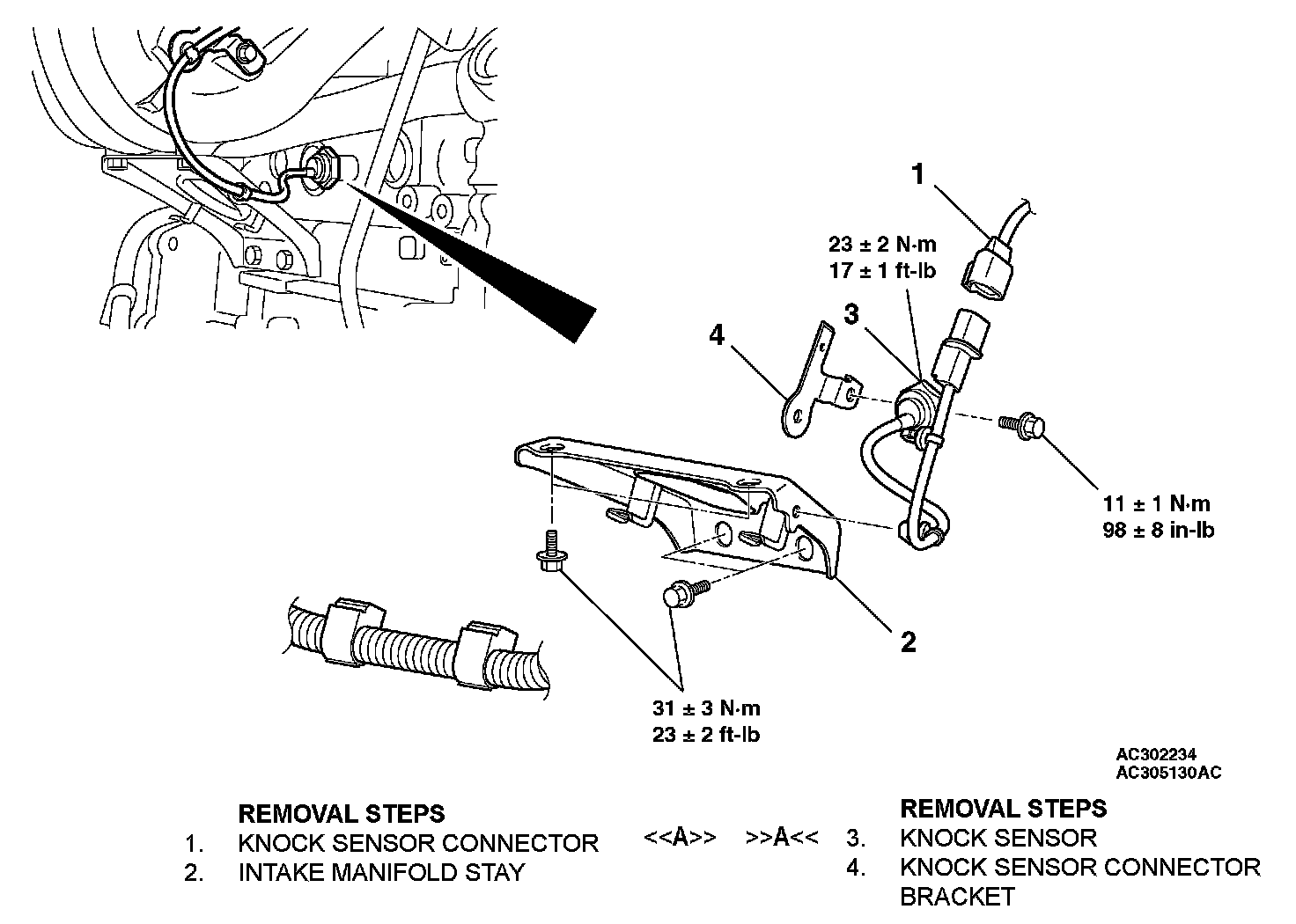 CAUTION: When the knock sensor replacement is performed, use scan tool MB991958 to initialize the learning value.