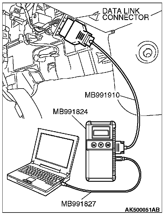 NOTE: Disconnecting the scan tool MB991958 is the reverse of the connecting sequence, making sure that the ignition switch is at the "LOCK" (OFF) position.