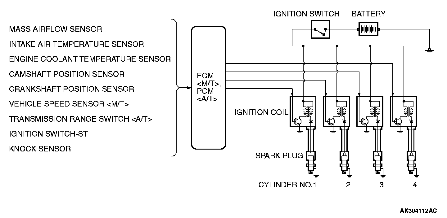 The ECM or PCM determines which ignition coil should be controlled by means of the signals from the camshaft position sensor which is incorporated in the camshaft and from the crankshaft position sensor which is incorporated in the crankshaft.