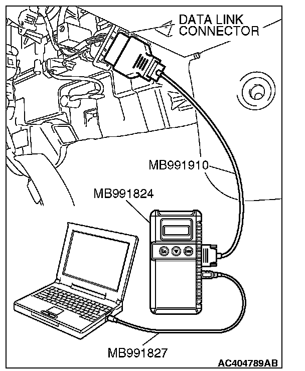 CAUTION: To prevent damage to scan tool MB991958, always turn the ignition switch to the "LOCK" (OFF) position before connecting or disconnecting scan tool MB991958.