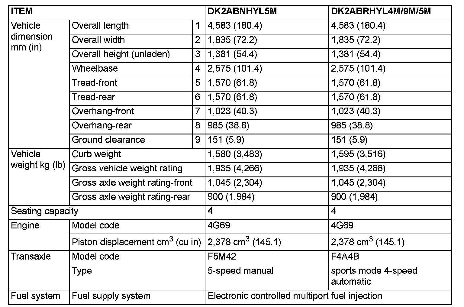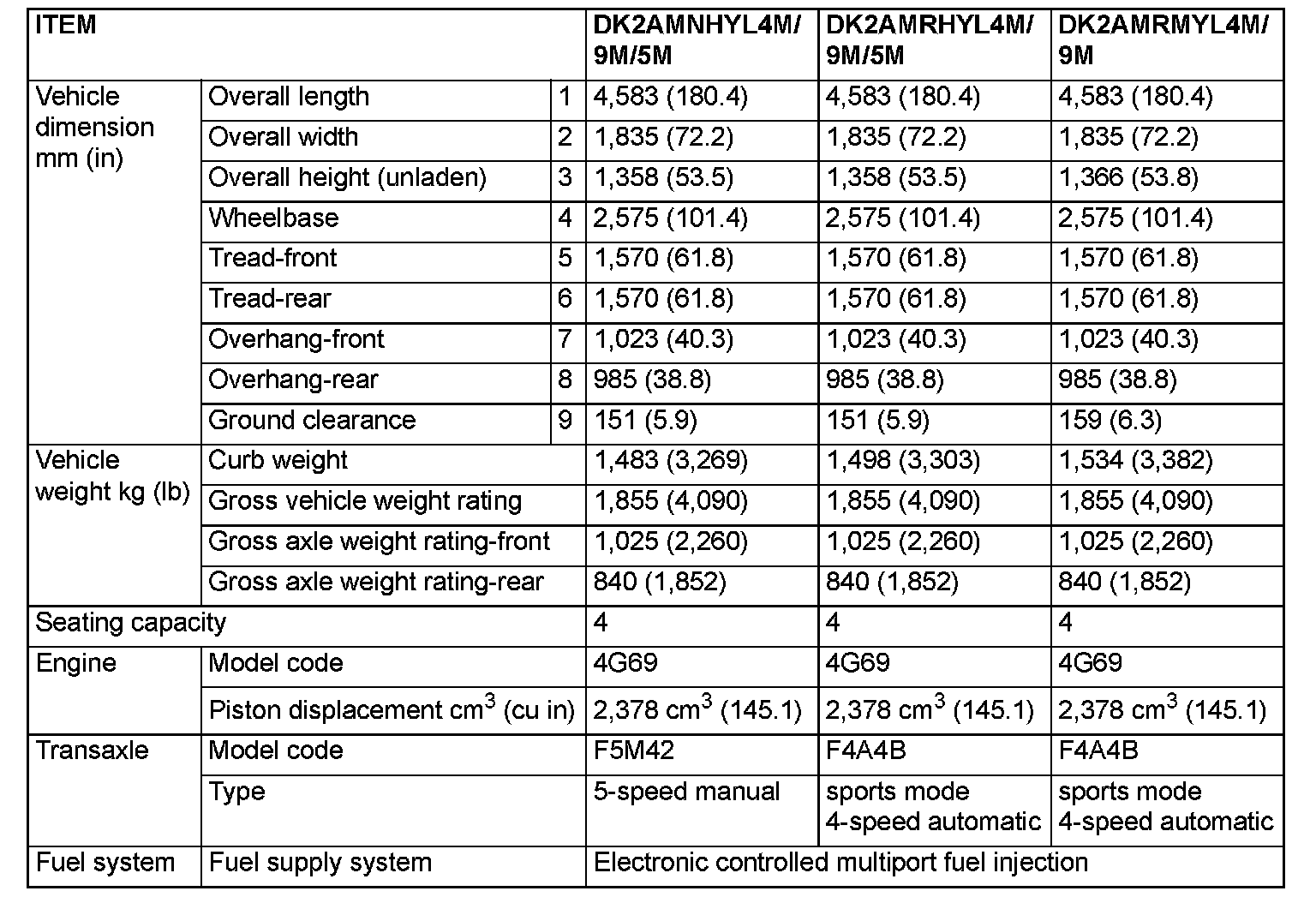 GENERAL SPECIFICATIONS (2.4L ENGINE)