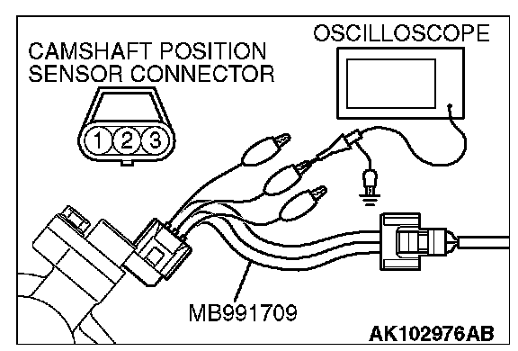 1. Disconnect the camshaft position sensor connector, and connect the test harness special tool (MB991709) between the separated connector (All terminals should be connected).