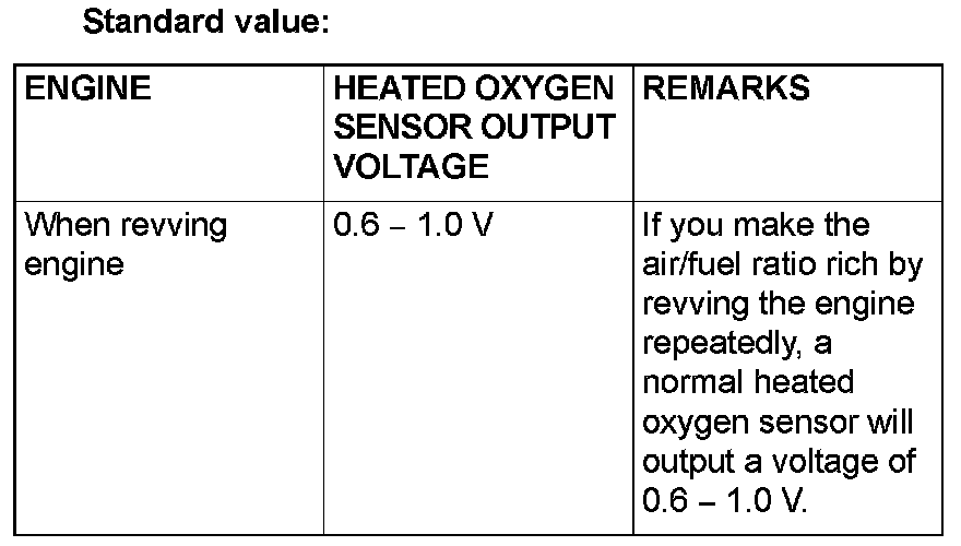 - If the temperature of sensing area does not reach the high temperature [of approximately 400 °C (752 °F) or more] even through the heated oxygen sensor is normal, the output voltage would be possibly low in spite of the rich air-fuel ratio.