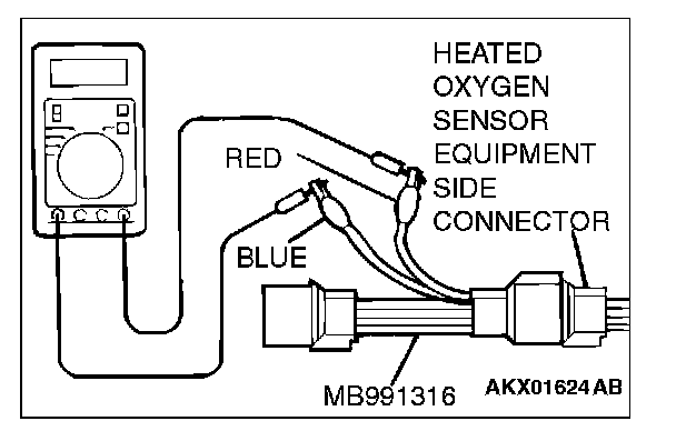1. Disconnect the heated oxygen sensor connector and connect special tool MB991316 to the connector on the heated oxygen sensor side.
