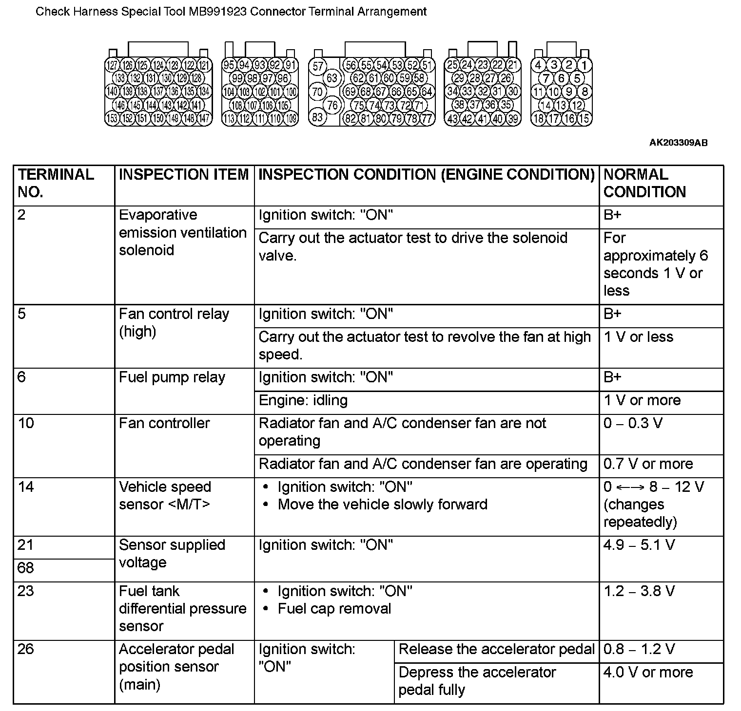 1. Disconnect the ECM [M/T] or the PCM [A/T] connectors B-19, B-20, B-21, B-22 and B-23, and connect check harness special tool MB991923 between the ECM [M/T] connectors or the PCM [A/T] connectors.