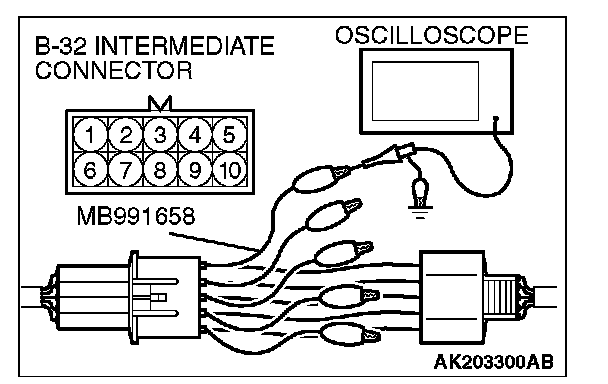 1. Disconnect the intermediate connector B-32, and connect the test harness special tool (MB991658) between the separated connector.