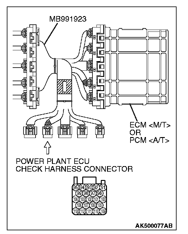1. Disconnect all ECM [M/T] connectors or PCM [A/T] connectors. Connect the check harness special tool (MB991923) between the separated connectors.