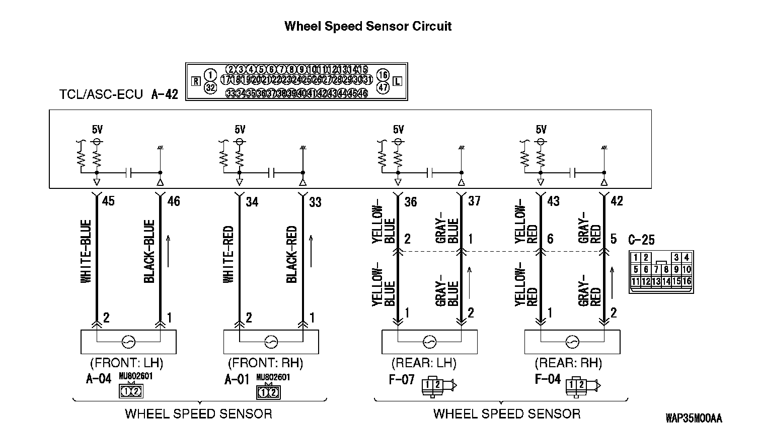 Q: Are TCL/ASC-ECU connector A-42 and wheel speed sensor [front: LH] connector A-04 damaged?