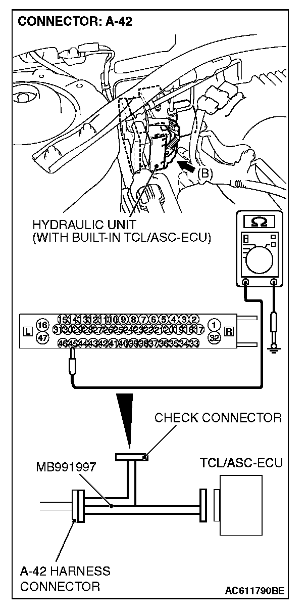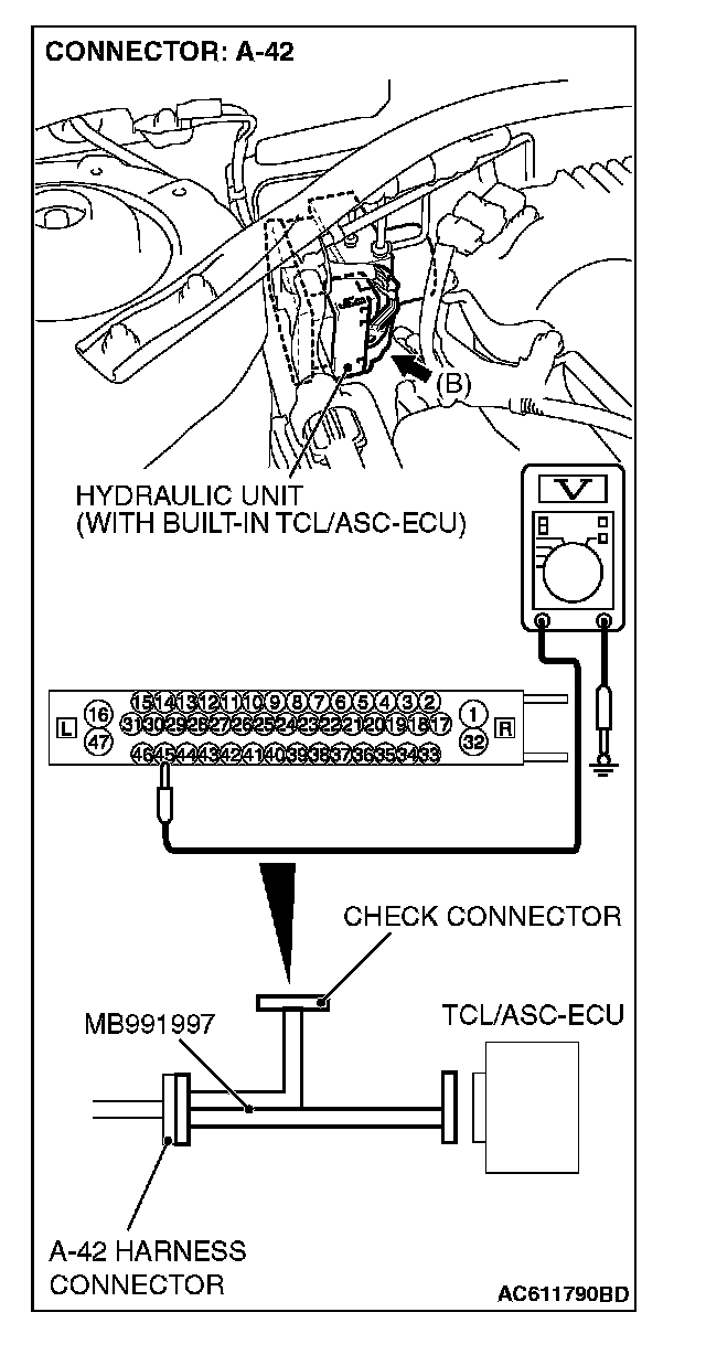 1) Disconnect the connector A-42, and connect special tool MB991997 to the wiring harness-side connector.